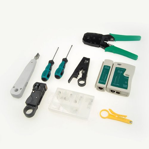 Cable Tester: For RJ-11, RJ-12, RJ-45, CAT5, CAT5e, 10/100BaseT, TIA-568A/568B, AT&T 258-A; 1, 2, 3, 4, 5, 6, 7, 8 and ground 9 LED lights; Indicate wiring connection on both remote and master unit. Judges wrong connection, short circuit and open circuit. Auto scanning function for rapid testing. Powered by one 9V battery (not included)Punch-down Tool: Terminates conductors on 110 blocks with cable stripping capability.Universal Cable Stripper/Cutter: Multi-function Stripper/Cutter for Network UTP/STP wire or cable from 3.2mm to 9mm. High quality; Correctly clear network cable without damaging vital components.3 ways Crimping Tool: Durable Crimping/Cutting/Stripping 3 in 1 Tool; Good for RJ-45, RJ-11 & RJ-12 connectors. Suitable for Cat5 and Cat5e cable with 8P8C, 6P6C and 4P4C plugs; Heavy-Duty; Rugged Carbon Hardened Steel Construction.See More Details >>